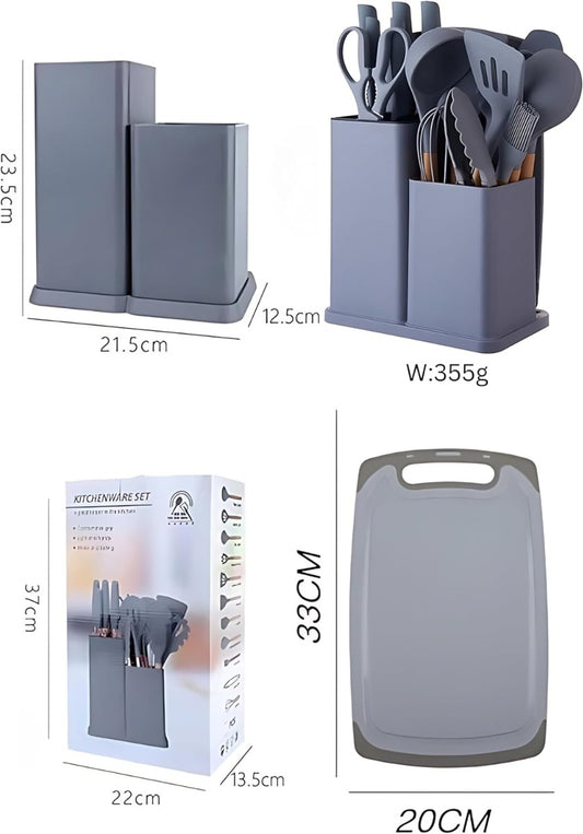 Set di Utensili da Cucina e Coltelli da Cucina da 19 Pezzi in Silicone con Manico in Legno (Grigio)