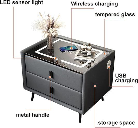 Comodino Intelligente con Ricarica Wireless e USB, Altoparlante Bluetooth, Comodino LED Multifunzionale con 3 Colori Oscurabili per Camera da Letto grigio